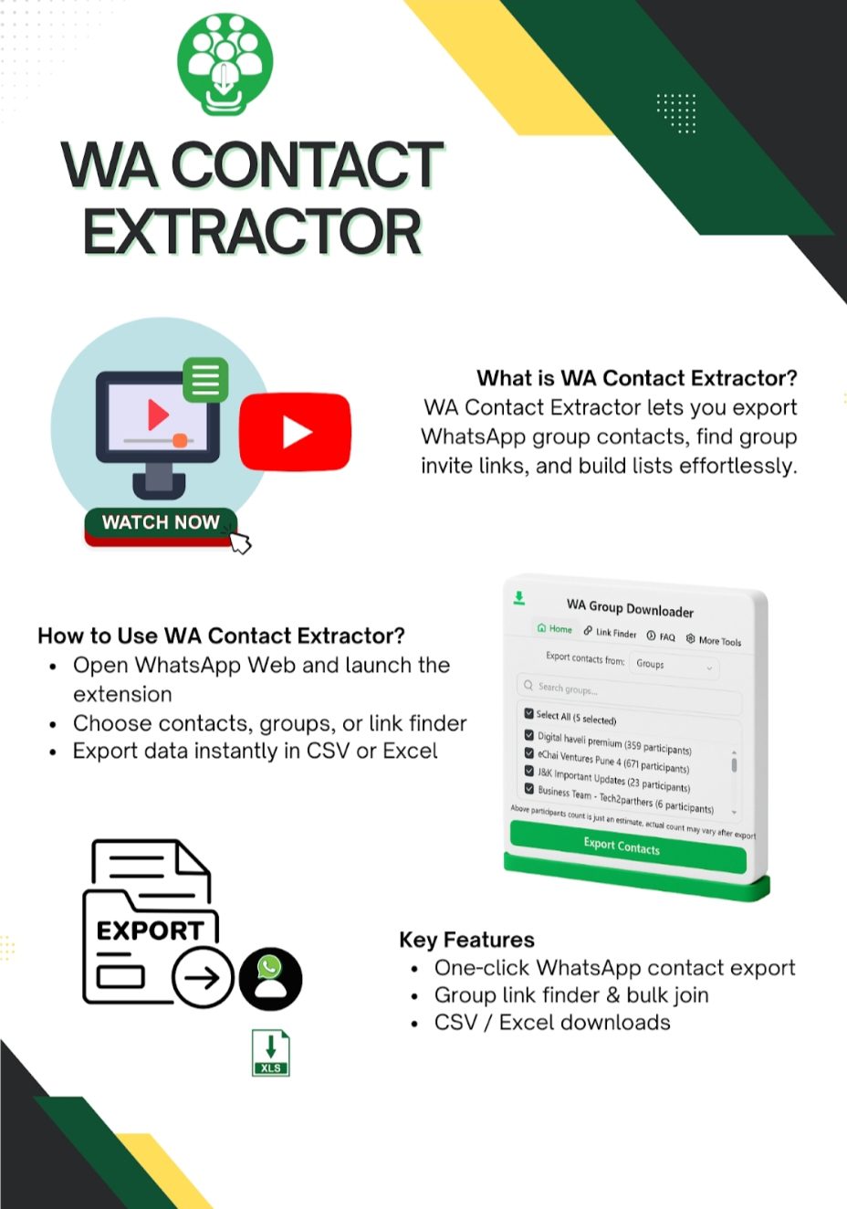 Install the WA Contact Extractor extension to start exporting WhatsApp group contacts and discovering invite links directly from your browser.