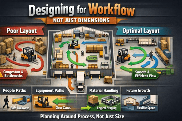 For logistics-intensive steel building uses, it’s building around receiving and shipping patterns rather than a “generic” footprint.